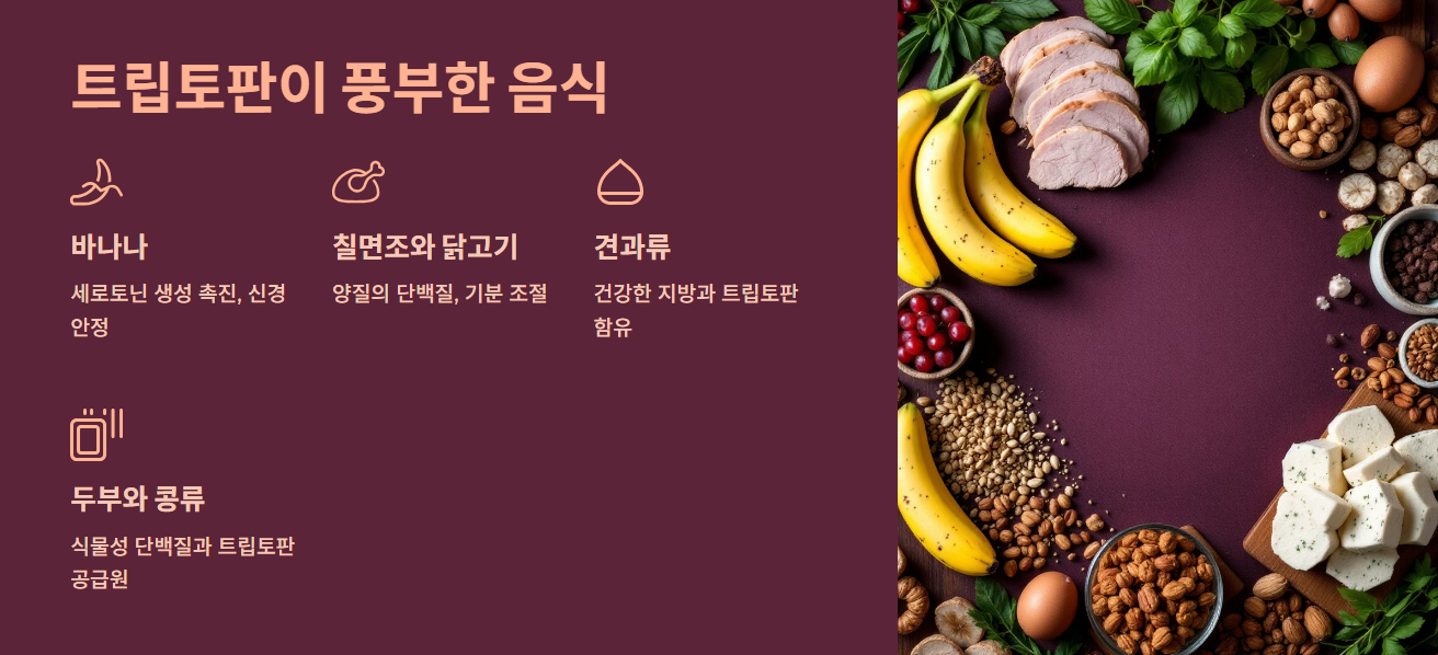 트립토판은 세로토닌(행복 호르몬)의 생성을 돕는 필수 아미노산으로, 우울증을 완화하는 데 중요한 역할을 합니다. 트립토판이 풍부한 음식으로는 다음과 같은 것들이 있습니다.