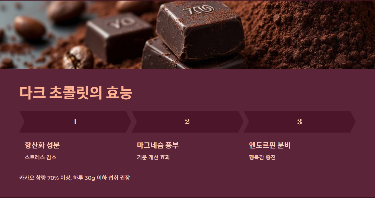 다크 초콜릿에는 항산화 성분과 마그네슘이 풍부하여 스트레스를 줄이고 기분을 개선하는 효과가 있습니다. 또한 엔도르핀 분비를 촉진하여 행복감을 느끼는 데 도움을 줄 수 있습니다. 다만, 당 함량이 높은 초콜릿은 피하는 것이 좋으며, 카카오 함량이 70% 이상인 다크 초콜릿을 하루 30g 이하로 섭취하는 것이 적절합니다.