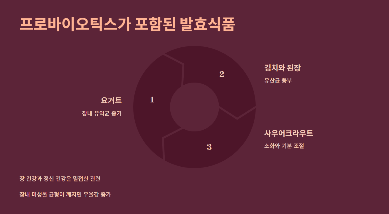 장 건강과 정신 건강은 밀접한 관련이 있으며, 장내 미생물 균형이 깨지면 우울감이 증가할 수 있습니다. 따라서 프로바이오틱스가 포함된 발효식품을 섭취하는 것이 중요합니다.