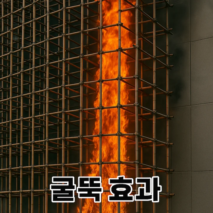 대나무 비계가 대형 화재의 피해를 키운다는 주장의 핵심은 바로 **'굴뚝 효과(Stack Effect)'**와 **'인화성'**에 있습니다.